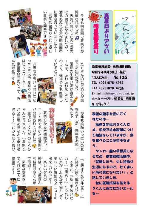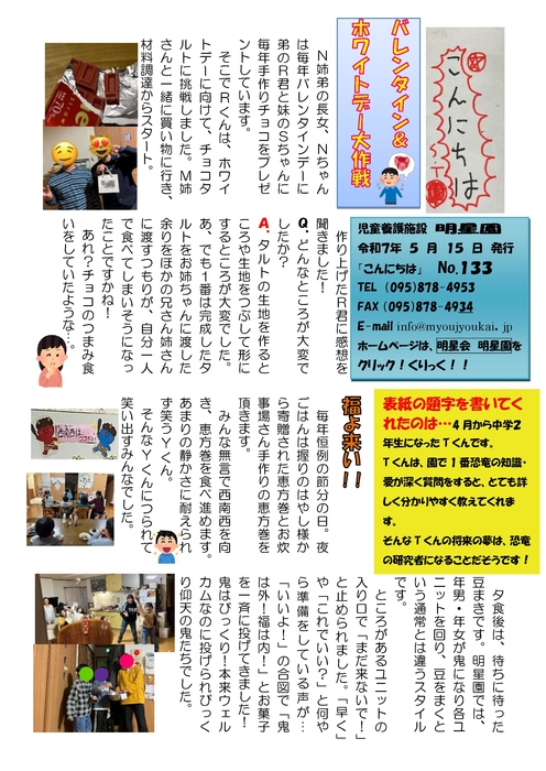 私たち明星園は子どもたちの話や気持ちに耳を傾け、全ての子どもが安心して幸せに生活することができるよう、日々努力しています。また、子どもたちにとって「もうひとつの家族」となれるよう、できる限り家庭に近い温かい雰囲気のなかで、安定した生活を送ることができるよう心を配っています。